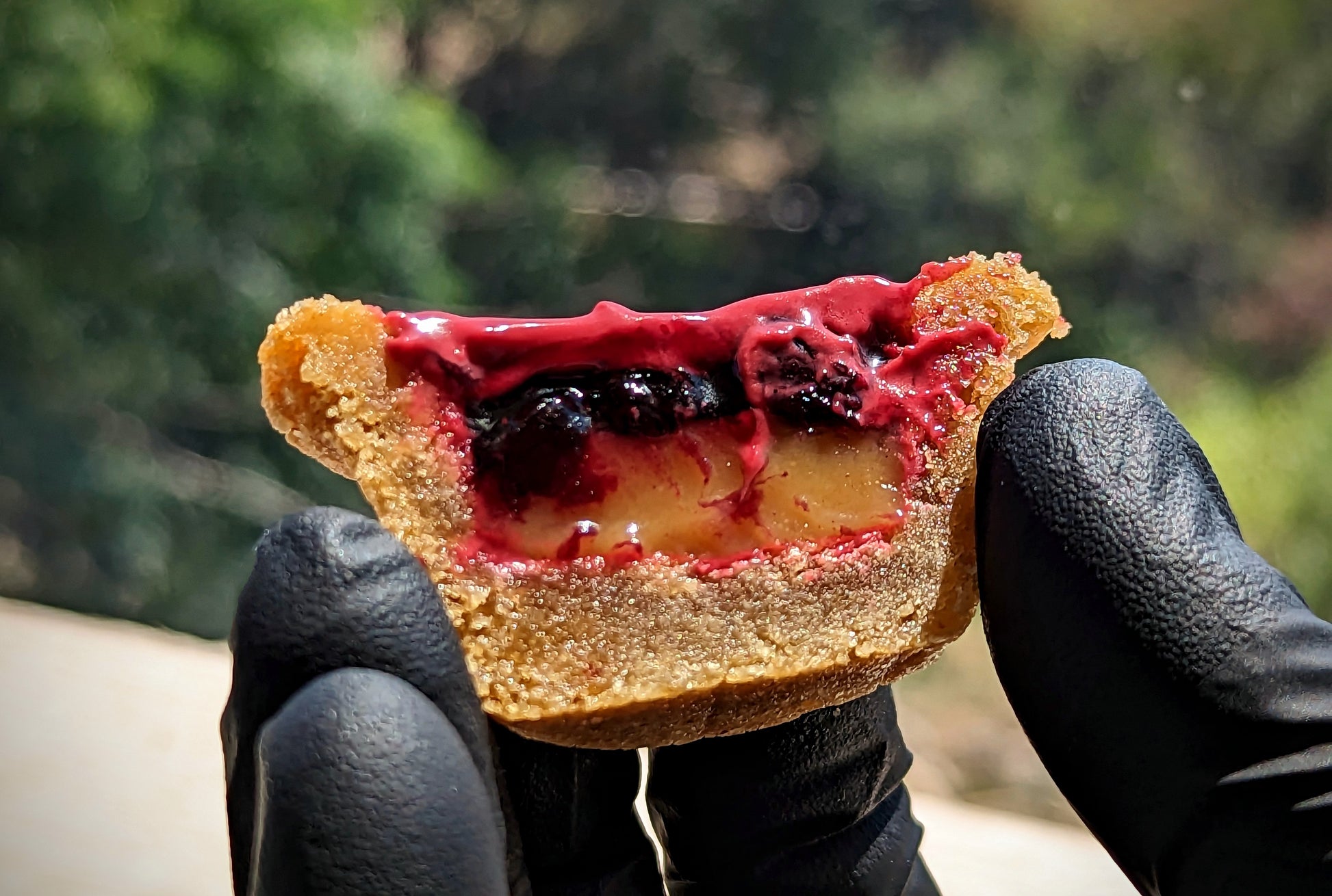 PB&J - Vanilla cookie base, peanut butter ganache, homemade berry jam, and topped with raspberry chocolate by Valrhona.